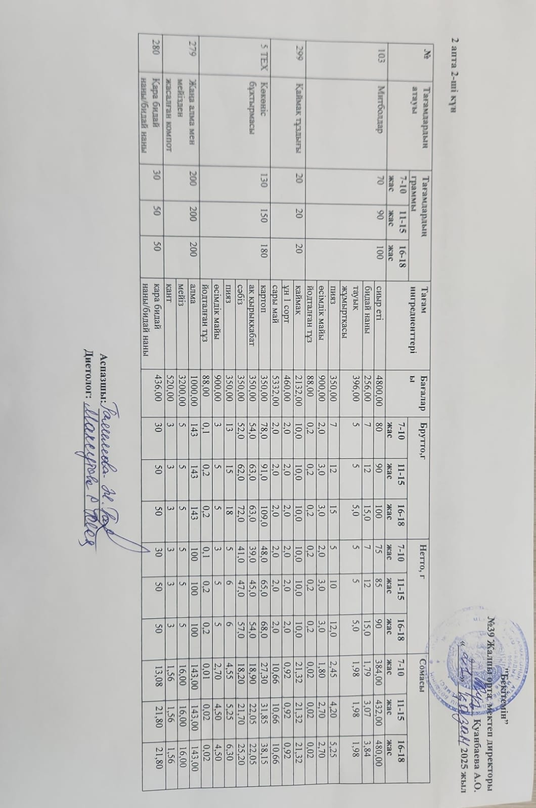 ЖАЛПЫ БІЛІМ БЕРЕТІН №39 ОРТА МЕКТЕПТІҢ ӘКІМШІЛІГІ ЖӘНЕ АТА АНАЛАР ҚАТЫСУЫМЕН МЕКТЕП АСХАНАСЫН ТЕКСЕРУ ЖҮРГІЗДІ. 21.10.2025 ЖЫЛДЫҢ МЕКТЕП АСХАНАСЫНДАҒЫ АС МӘЗІРІМЕН ТАНЫСУ, ОНДАҒЫ ТАМАҚТАРДЫҢ САЛМАҒЫН КАЛОРИЯСЫН ӨЛШЕУ, АСХАНА ІШКІ ТАЗАЛЫҒЫН, ШИКІЗАТ САҚТАУ ҚОЙМАЛАРЫ ТЕКСЕРІЛДІ. МЕКТЕП АСХАНАСЫНАН БАСТАУЫШ СЫНЫПТАР БОЙЫНША — 837 ОҚУШЫ ТЕГІН ТАМАҚТАНСА, 5-11 СЫНЫПТАР (АЗ ҚАМТЫЛҒАН) БОЙЫНША -34 ОҚУШЫ ТЕГІН ТАМАҚТАНАДЫ.