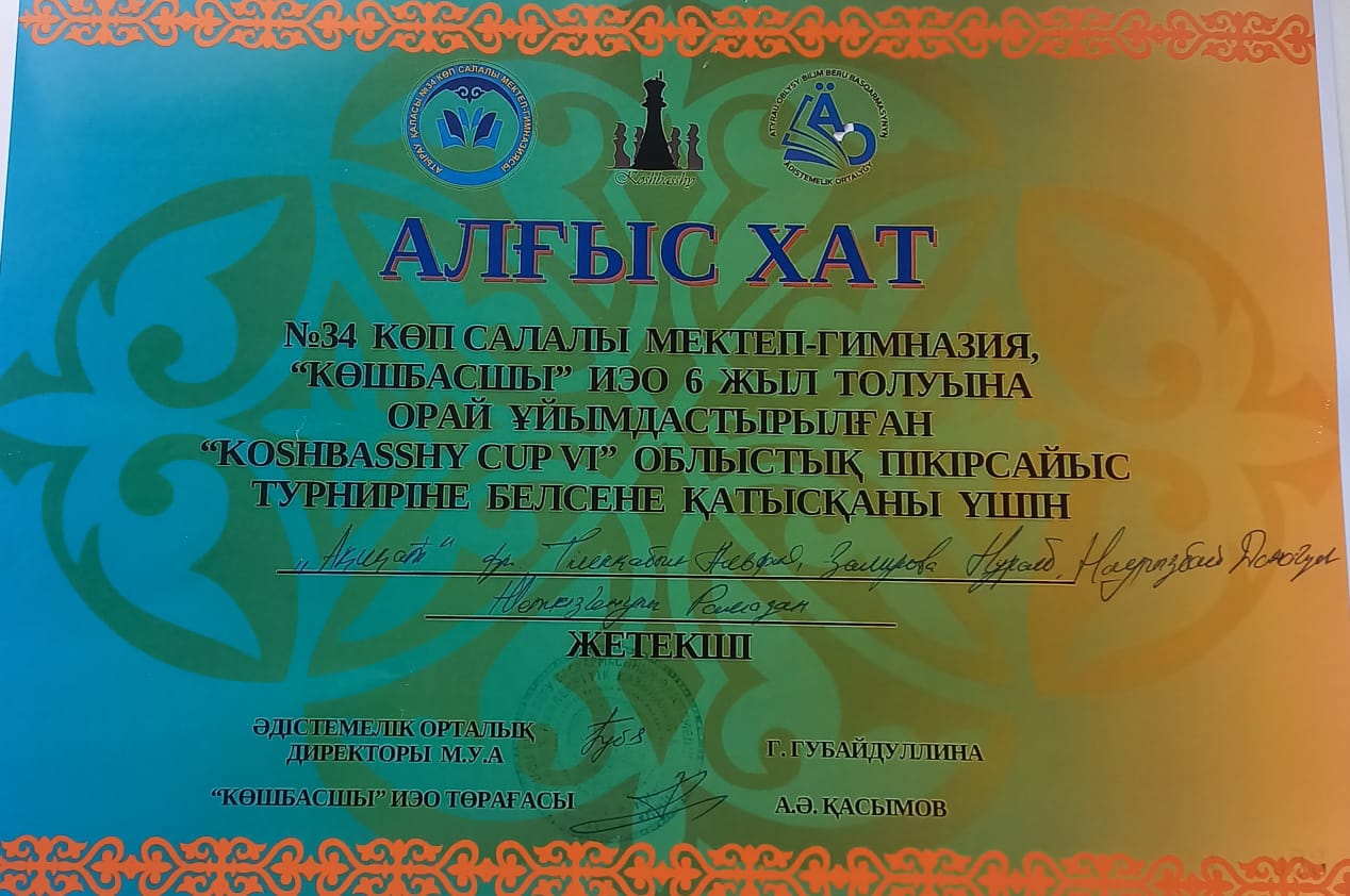 Мектебіміздің «Ақиқат» дебат клубы 34 көпсалалы гимназияда өткен Koshbasshy cup VI обылыстық турниріне қатысқан болатын. Облыстың түкпір-түкпірінен келген 44 фракцияның ішінен финалға өтіп алғыс хатпен марапатталды.