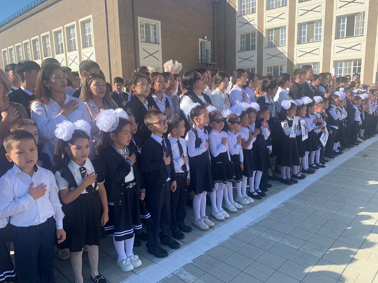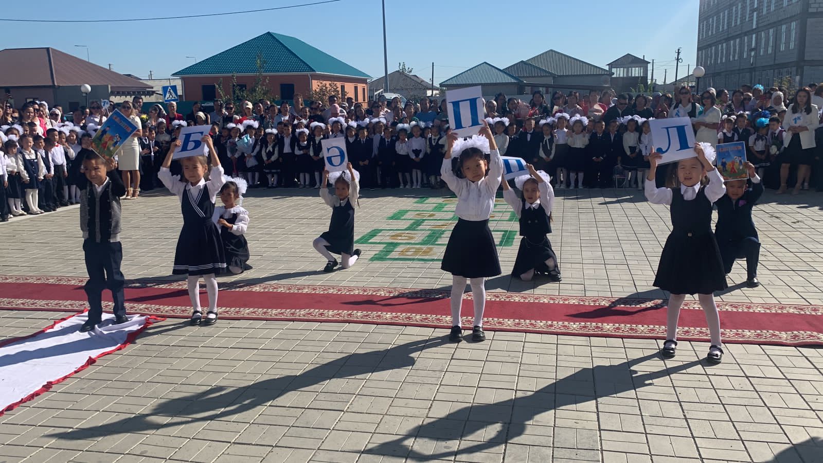 Мектеп табалдырығын алғаш аттап отырған 1-ші сынып оқушылары тақпақтарын айтып, жұрттың қошеметіне бөленді. Алғашқы қоңырау соғу рәсімін мектебіміздің жас бүлдіршіндері Нұраден Адият пен Нұрлыбек Асылай алаңды айнала сылдырлатып, барша қонақтарды айырықша әсем күйге бөлей кетті.